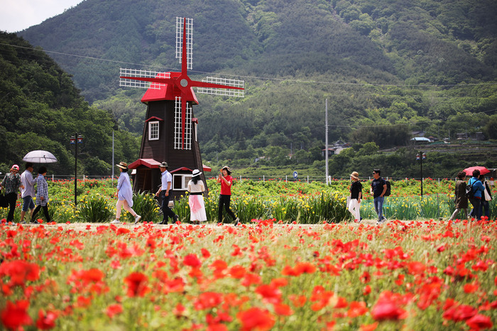 붉은 꽃양귀비가 끝없이 펼쳐지는 하동 북천입니다. 기찻길 옆 붉은 비단처럼 일렁이는 꽃물결 사이로 인생 사진을 남겨보세요. 지리산 자락과 어우러진 봄의 향연이 기다립니다.